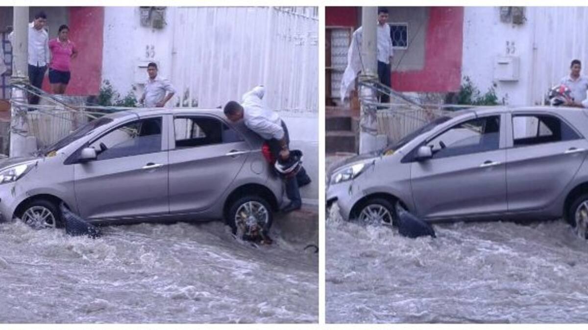 El carro fue sujetado de varias cuerdas a un poste, logrando así que no fuera arrastrado por las aguas del arroyo.