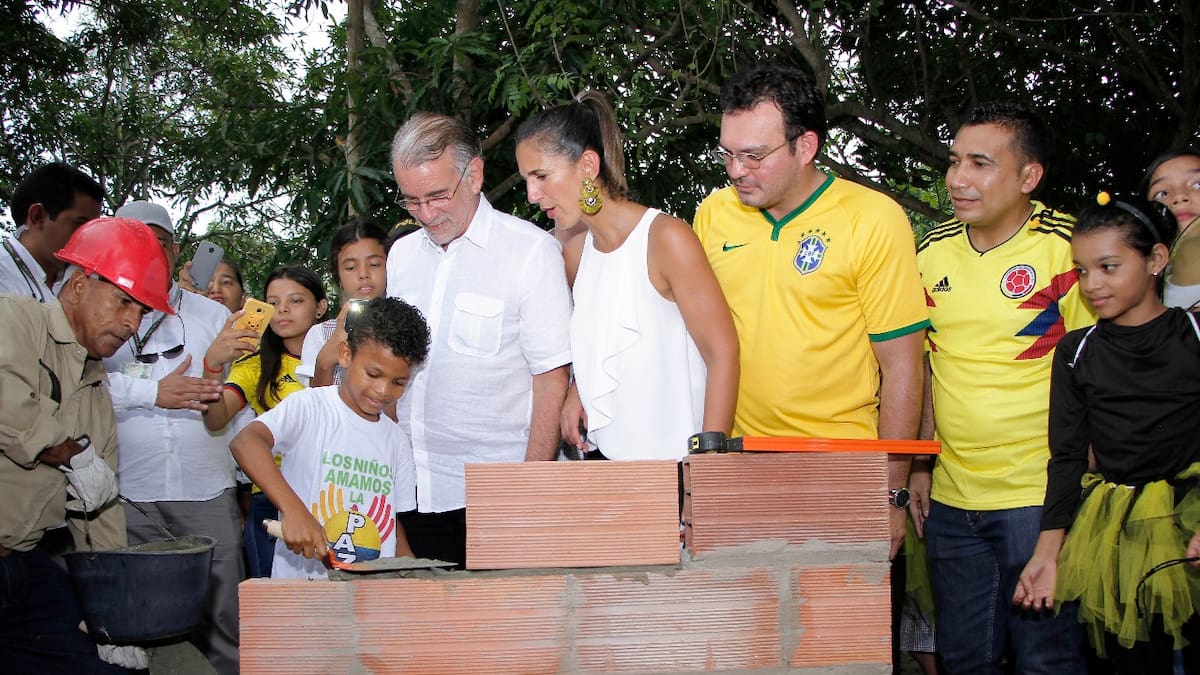 El gobernador Eduardo Verano De la Rosa y la ministra de Educación, Yaneth Giha, en compañía de los estudiantes de esta institución pusieron la primera piedra del colegio que beneficiará a 1.240 estudiantes de Sabanalarga.