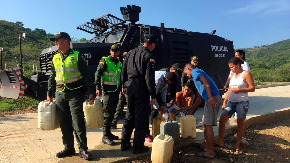 Desde este martes el Esmad (Escuadrón Móvil Antidisturbios), se despojaron de sus robustas armaduras para realizar esta bonita labor en el corregimiento de Arroyo Negro, donde cerca de 800 habitantes están pasando necesidades por falta de agua, pues no cuentan con un suministro permanente para suplir sus necesidades.