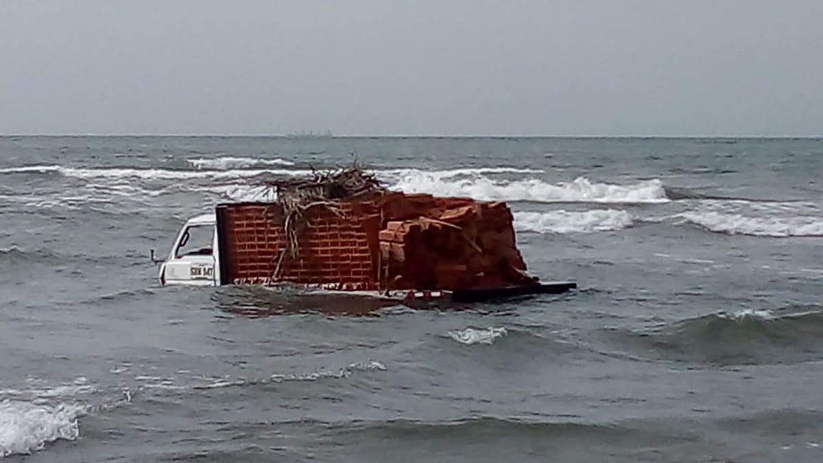 Este viernes un camión tipo furgón -que iba cargado de ladrillos- terminó en el mar tras quedar sin frenos cuando transitaba por una loma del corregimiento de Salgar.
