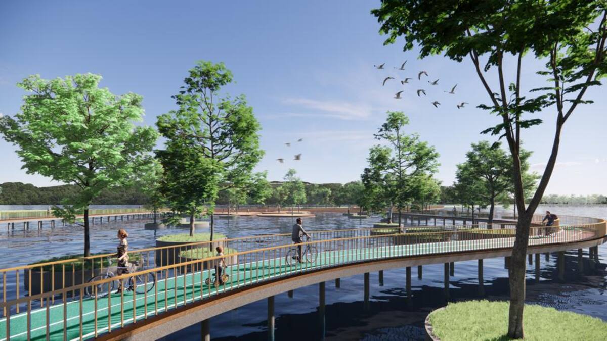 La primera etapa del ecoparque, proyectada para ser entregada en el primer semestre de 2022, incluirá 1.835 metros lineales de senderos peatonales, construidos en madera, con un ancho estándar de 3 metros.