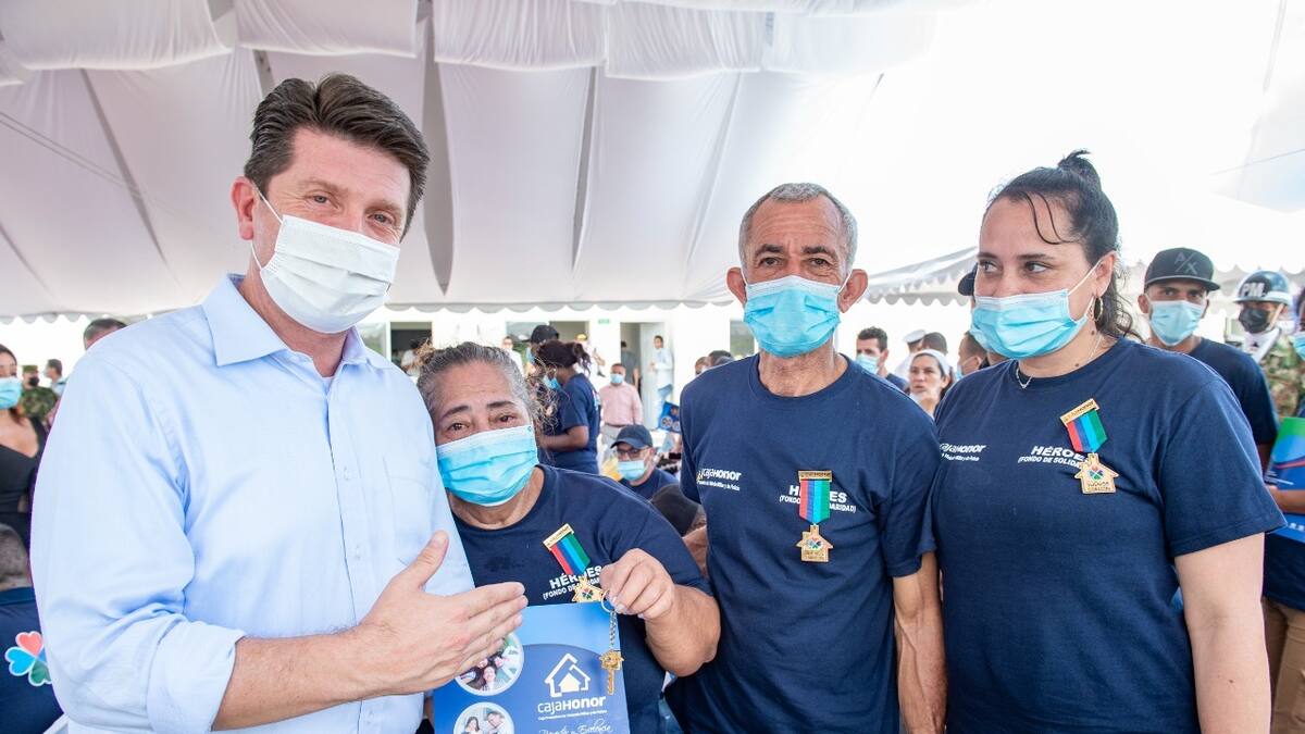 El ministro de Defensa, Diego Molano, realizó este sábado la entrega de las llaves y los documentos de 40 nuevos propietarios de viviendas a igual número de familias de policías y militares en el municipio de Sabanalarga, Atlántico.