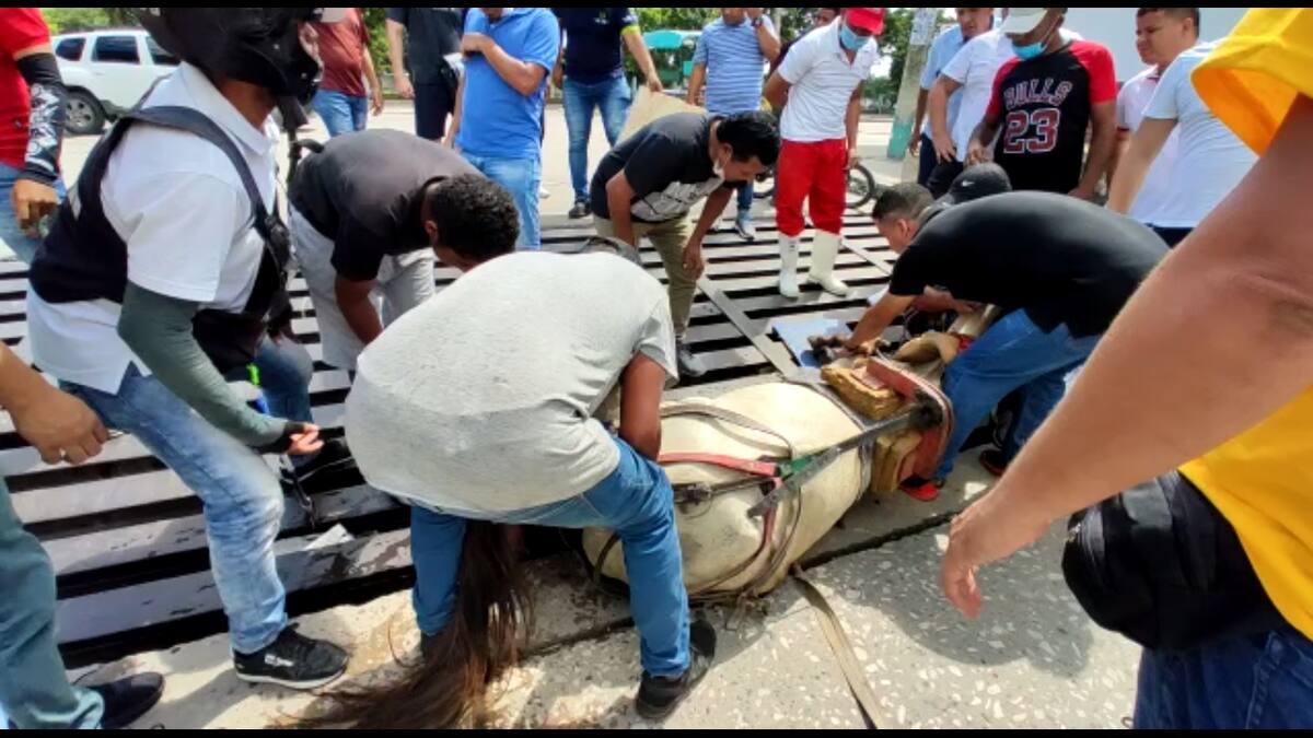 Este sábado en la calle 30 con carrera 45b, un caballo quedó atrapado en una rejilla de canalización.