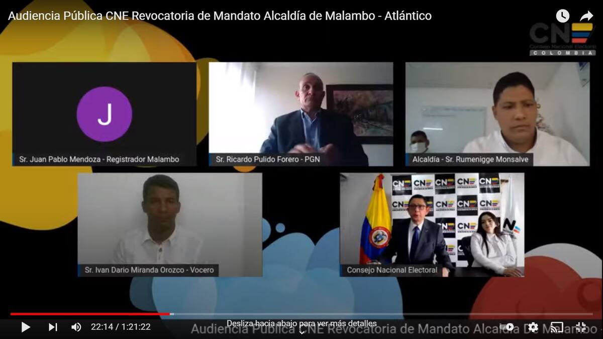 Este martes se llevó a cabo, de manera virtual, la audiencia pública de revocatoria del alcalde de Malambo, Rumenigge Monsalve, en la que el mandatario se defendió de las acusaciones de algunos líderes comunales del municipio por supuesto incumplimiento de su Plan de Gobierno.