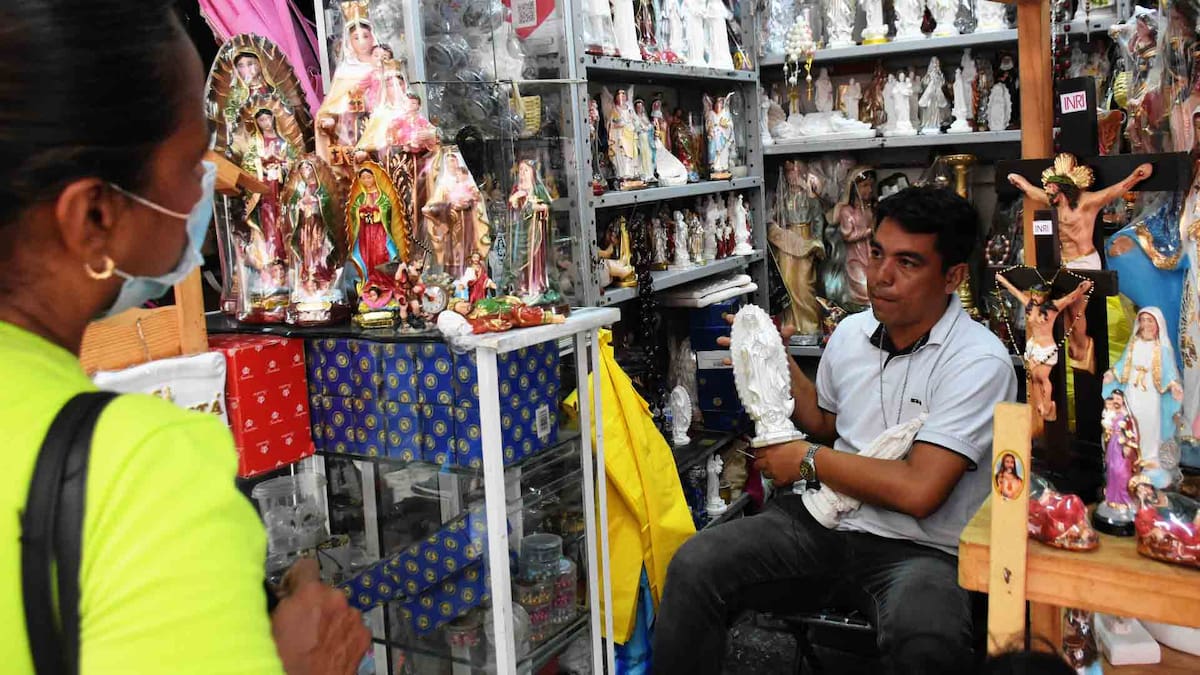 Una creyente se acercó a cotizar el valor de las vírgenes que colocadas en los mostradores, estaban siendo testigo de aquel momento. Los precios, acabados y tamaños fueron parte de aquella rúbrica presentada por la cliente hacia el comerciante quien tuvo todas las respuestas para cada una de sus inquietudes.