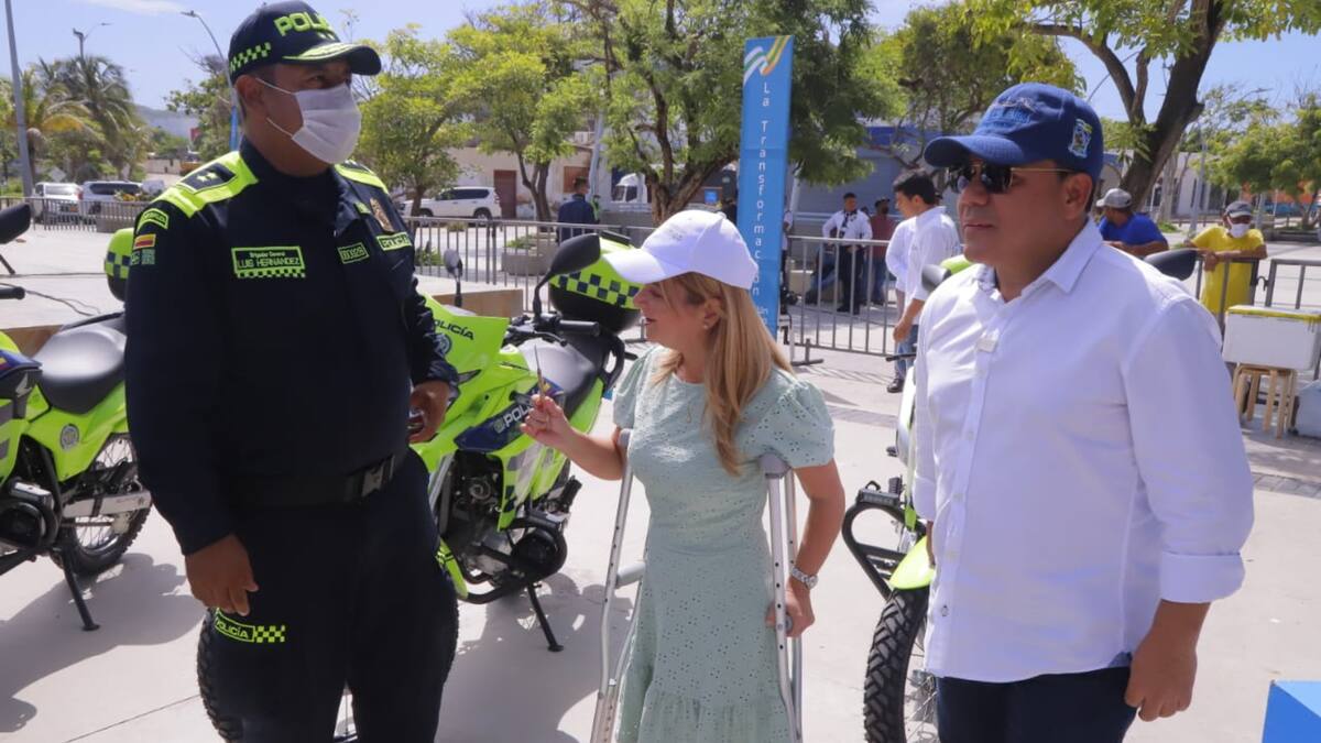 La gobernadora del Atlántico, Elsa Noguera, y el alcalde de Puerto Colombia, Wilman Vargas, hicieron entrega de ocho motocicletas, dos drones y 40 avanteles a la Policía del municipio.