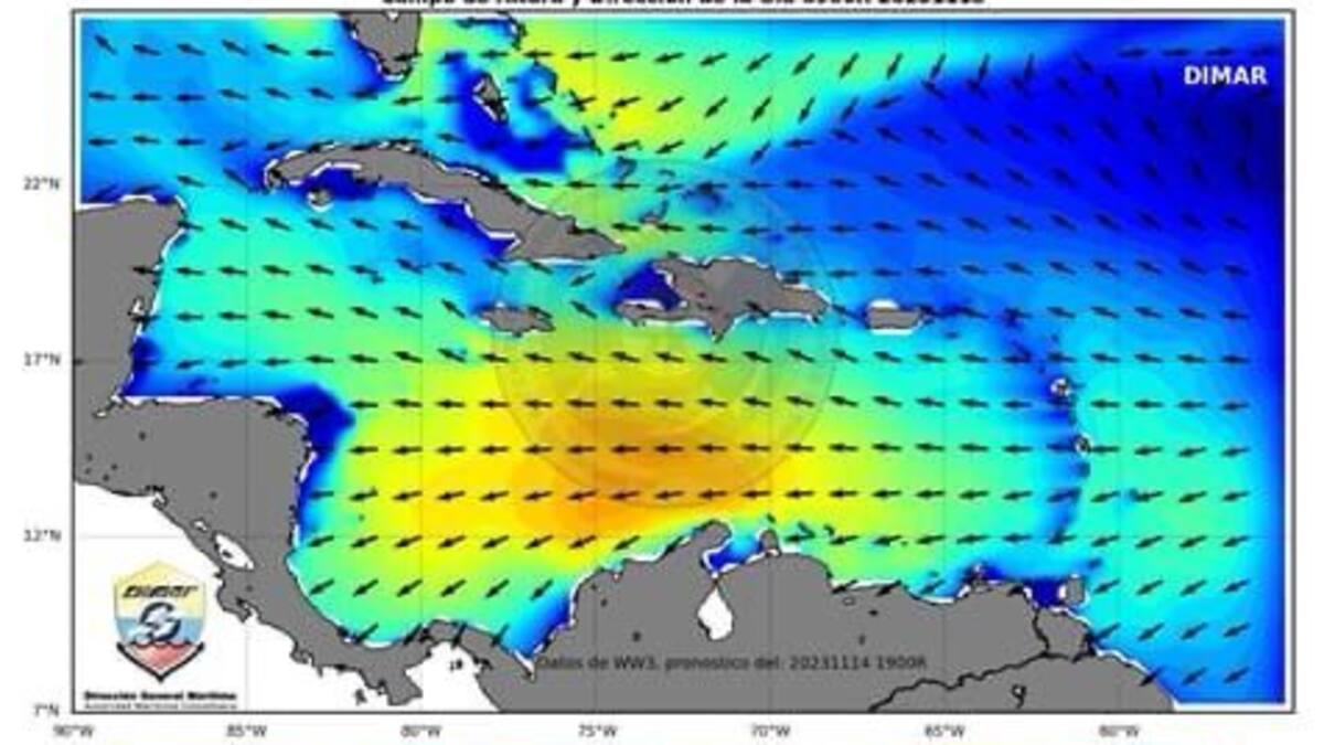 La autoridad marítima detalló que se observa una altura de la ola que oscila entre 1.8 y 3.0 metros, debido a la interacción entre un sistema de alta presión ubicado al este del océano Atlántico norte, con la baja presión del Darién ubicada al centro sur del litoral Caribe colombiano.