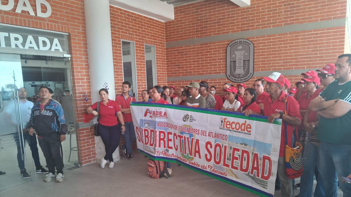 En las afueras de la sede de la Alcaldía de Soledad, un grupo de docentes realizó una protesta en la mañana de este jueves.