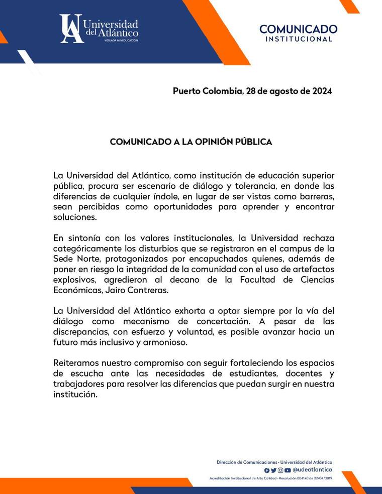 A través de un comunicado oficial emitido el pasado miércoles, 28 de agosto, la Universidad del Atlántico condenó enfáticamente los disturbios ocurridos recientemente en el campus de la Sede Norte de la institución. Durante los incidentes, un grupo de individuos encapuchados llevó a cabo acciones que pusieron en riesgo la seguridad de la comunidad universitaria, utilizando artefactos explosivos y agrediendo al decano de la Facultad de Ciencias Económicas, Jairo Contreras.