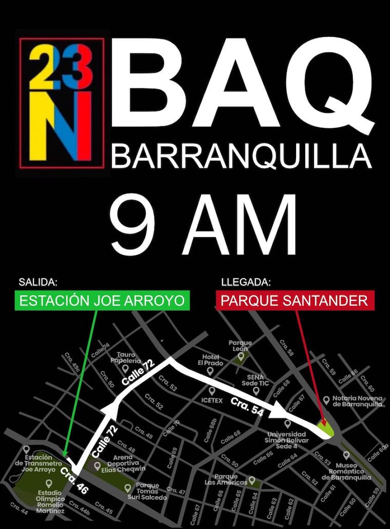 La cita en la capital del Atlántico será a las 9:00 a. m. en la plazoleta del Joe Arroyo. De allí tomarán hasta la calle 72 hasta la carrera 54 para finalizar en el Parque Santander.