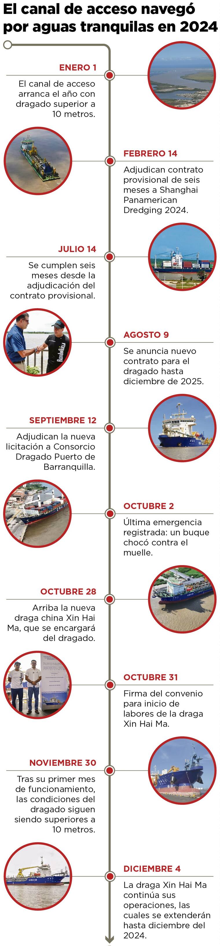 Según Álvaro Redondo, director de Cormagdalena, en el 2024 entraron por el canal de acceso más de 13 millones de toneladas en carga a Barranquilla, misma que puede costar entre cinco y seis millones de dólares, logrando 23 meses de calado estable, hasta este mes de diciembre.