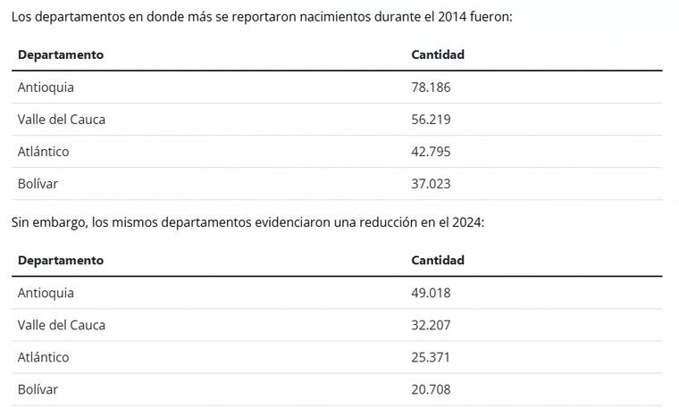 Los departamentos que lideran la lista de los que evidenciaron una mayor reducción de nacimientos en el 2024 son Antioquia, Valle del Cauca, Atlántico y Bolívar.