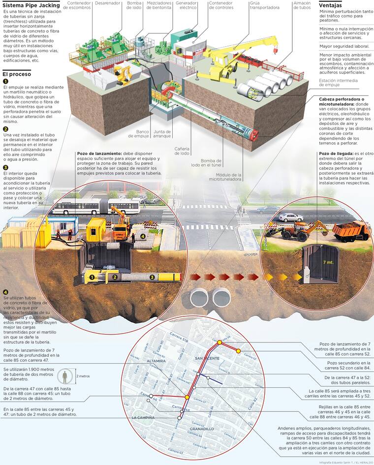 Para la ejecución de los trabajos se utilizará el sistema Tunelación Jacking Pipe (ver gráfico), que consiste en instalar tuberías sin hacer zanjas en las vías, por lo que no se afectaría en gran medida el tráfico de vehículos por la zona donde pasará el canal que encauzará las aguas del arroyo.
