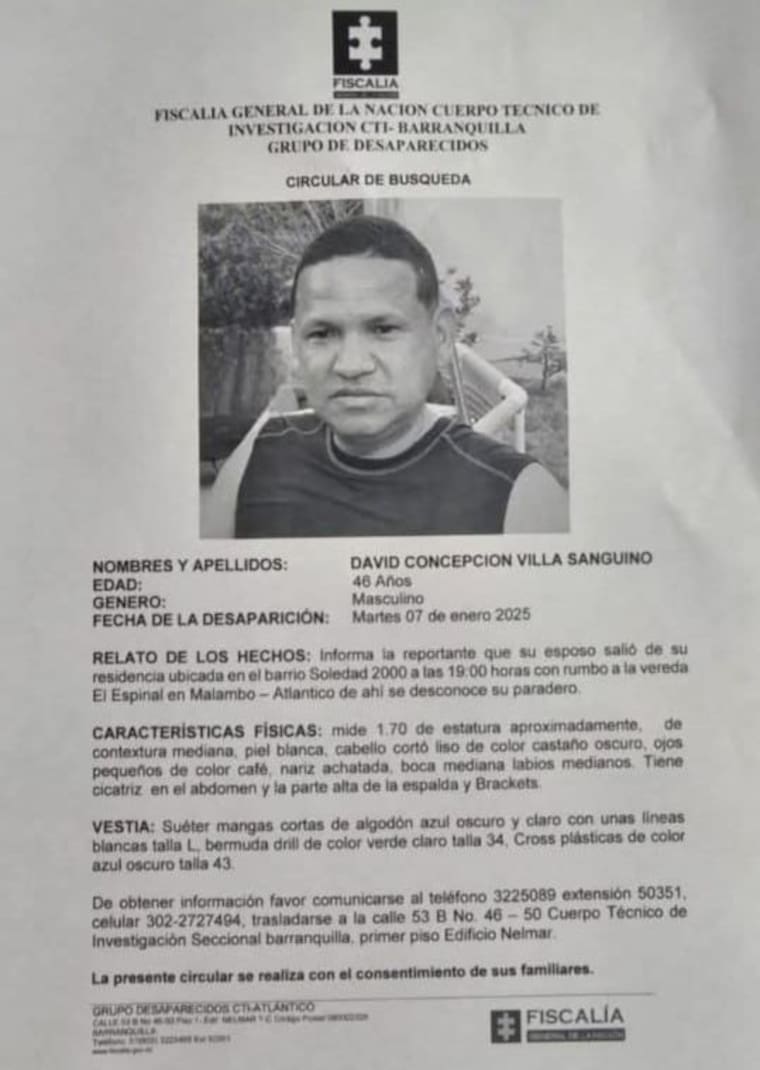 De acuerdo con la circular de búsqueda de la Fiscalía, Villa Sanguino fue visto por última vez hacia las 7:00 de la noche del martes anterior, cuando salió de su residencia ubicada en el barrio Soledad 2.000.