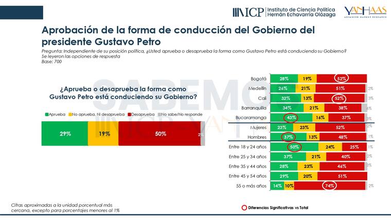En este sondeo, el presidente Gustavo Petro no salió bien librado debido a que el 50 % de los encuestados aseguró que desaprueba la forma en que está conduciendo su Gobierno. El jefe de Estado solo tiene el respaldo del 29 %, mientras que el 19 % restante eligió la opción ‘no aprueba ni desaprueba’.