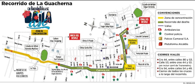 Además, comprende el recorrido del desfile, que inicia en la carrera 44 con calle 70, para bajar por la carrera 44 hasta llegar a la calle 53, donde girará a la izquierda para tomar la calle 53 hasta la carrera 54. En ese punto tomará la derecha y continuará hasta la Casa del Carnaval.