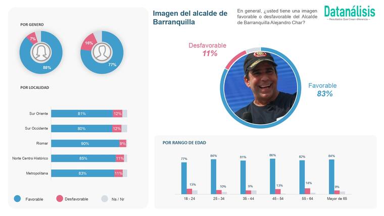 La gestión de Char cuenta con un respaldo del 88 % en la localidad Riomar, mientras que en la localidad Norte Centro Histórico se ubica en 86 %. En las localidades Suroccidente y Suroriente fue del 83 %, así como en la localidad Metropolitana fue del 80 %.
