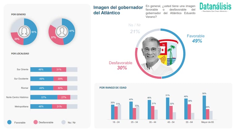 Con relación a la imagen del mandatario departamental, el 49 % indicó que es favorable y el 30 % dijo que era desfavorable. En esta categoría, el 21 % de los encuestados se decantó por la opción ‘No sabe/no responde’.