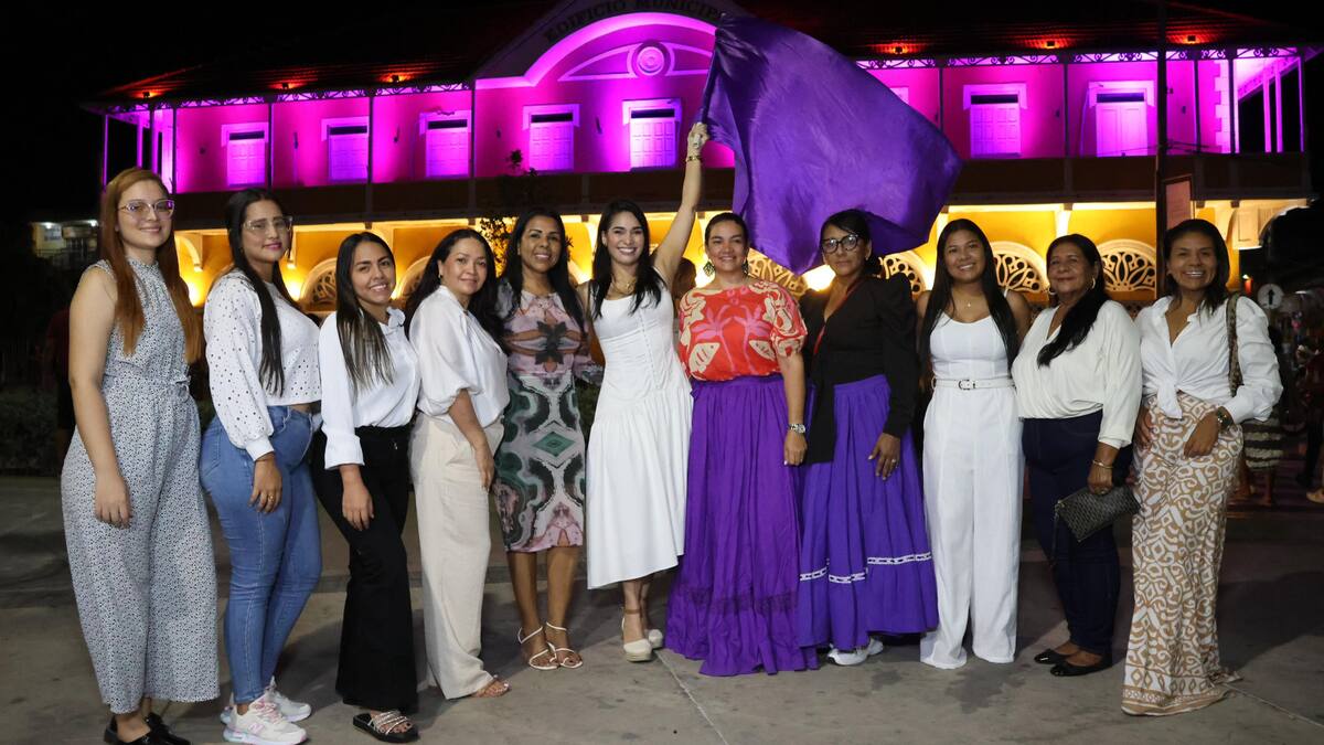 La Alcaldía de Puerto Colombia se encargó de que el municipio se ‘vistiera’ de púrpura, símbolo de la lucha feminista, por lo que el Palacio Municipal estaba también iluminado con luces de dicho color.