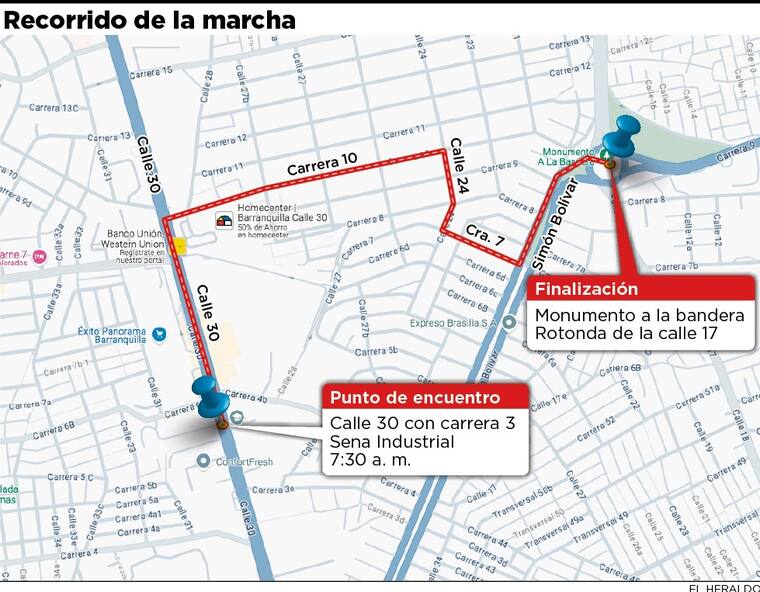 En Barranquilla, la jornada es liderada por sindicatos, organizaciones sociales y movimientos ciudadanos e iniciará a las 7:30 a. m. y el punto de concentración se ha definido en el Sena de la calle 30. La manifestación finalizará en la rotonda de la calle 17, en el suroriente de la capital del Atlántico.