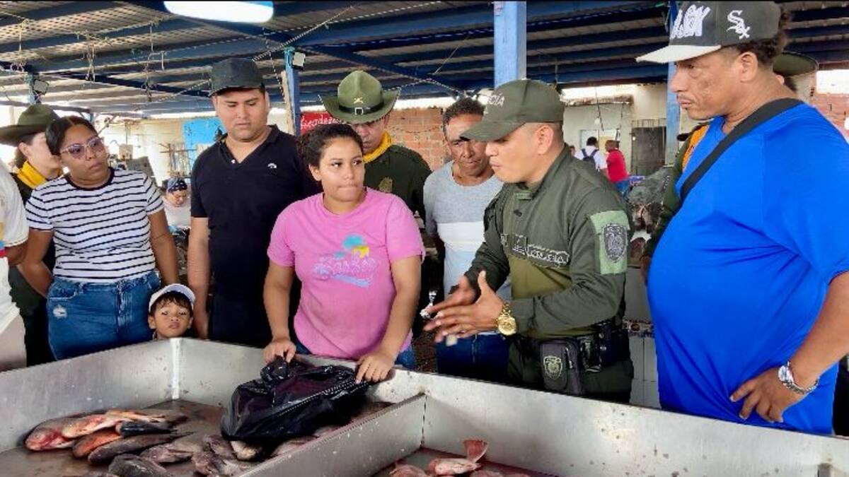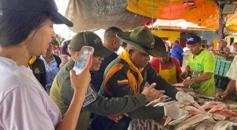 Uniformados de la Policía Metropolitana de Barranquilla adelantan operativos de control en la Plaza de Pescado en los días de Semana Santa con el objetivo de garantizar la seguridad y verificar las condiciones sanitarias de todos los productos de mar y río que se comercializan en este punto.