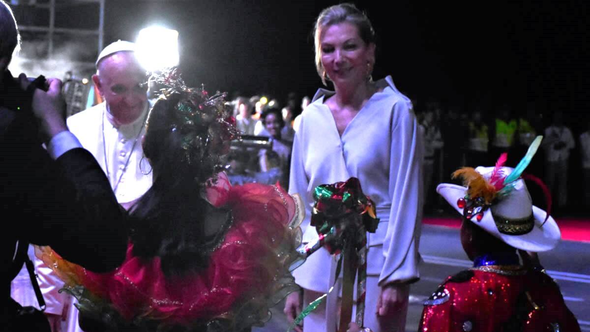 Esos sonidos le bastaron para arrancarle unas palmas a Francisco, quien le dedicó unas sonrisas y bendiciones a los bailarines presentes durante esa noche, quienes eran un total de 80 artistas, liderados por la reina Valeria Abuchaibe.