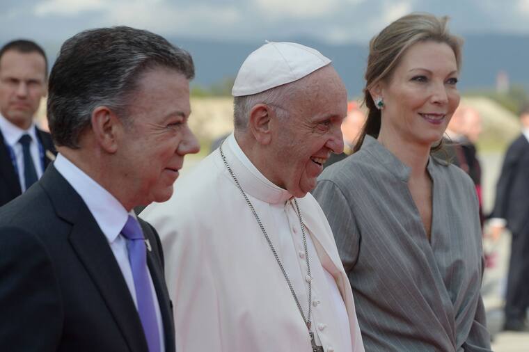Una vez aterrizó en el aeropuerto militar de Catam, el pontífice fue recibido por el entonces presidente Juan Manuel Santos y la primera dama.