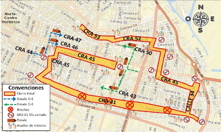 Quienes transiten por la carrera 44 podrán tomar la carrera 46 o 47. Se dispondrán broches en la carrera 41 con calles 38, 45, 50 y 54.