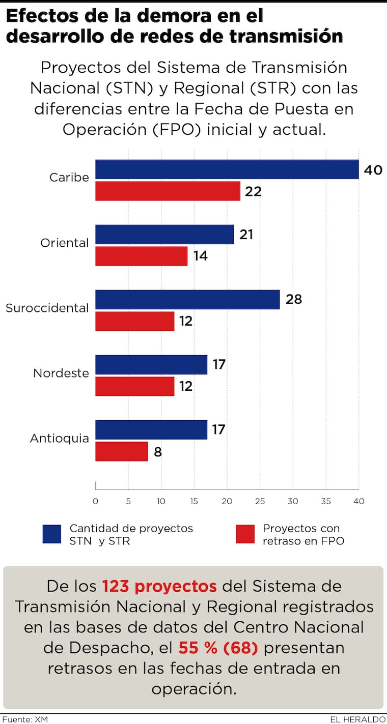 El Caribe es la región con mayor número de proyectos (40), pero también con la mayor cantidad de retrasos (22).