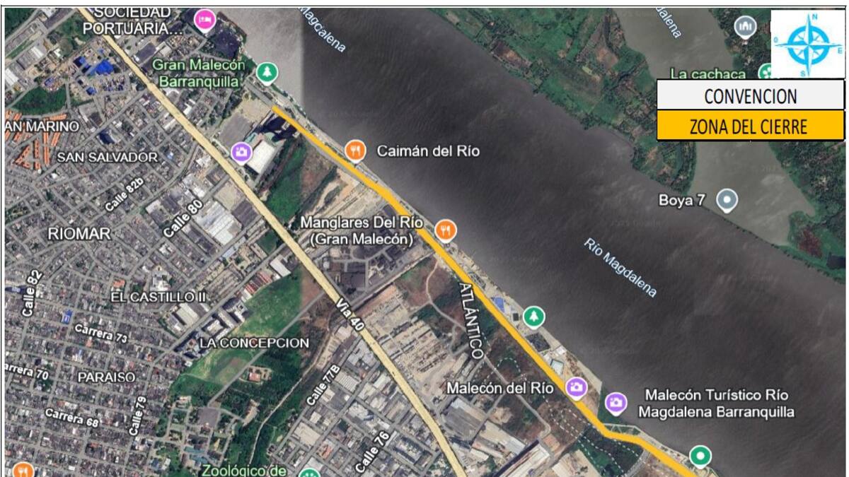 El despacho informó que, de 6:00 a.m. a 9:00 a.m., no está habilitado el acceso a la avenida del Río desde la calle 80 hasta la Ventana de Campeones; así como el de la calle 78 entre la avenida del Río y la vía 40, y el de la calle 72 entre vía 40 y avenida el Río.