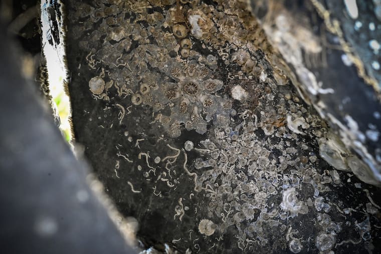 En su superficie resguarda la historia de su recorrido: conchas de moluscos, de múltiples capas, decoran su cuero, mientras que varios cirrípedos —una clase de crustáceo— se alzan como pequeños valles en sus bordes internos. Ella, que recorrió el mundo volando sobre las nubes, cayó a las profundidades del océano.