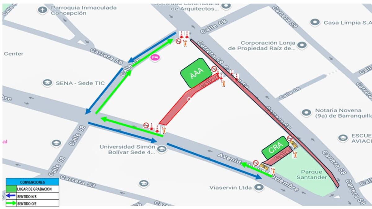 Es de anotar que los cierres en la carrera 58 entre calles 67 y 68 se realizarán solo en el momento de la grabación, por lo que los conductores que transiten por las calles 66 y 67 sentido sur-norte pueden tomar la calle 68 y en sentido norte-sur o la carrera 59. Los conductores que transiten por la carrera 58 sentido oeste-este, pueden tomar la calle 68 hasta la carrera 59.