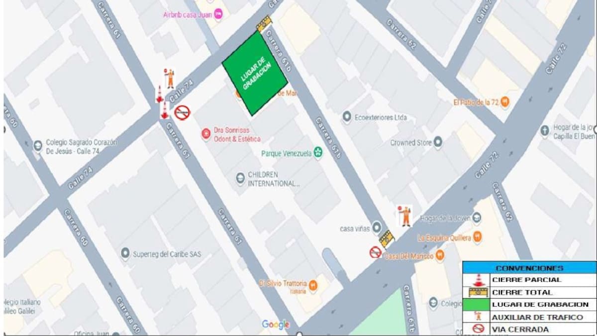 Finalmente, el 23 de julio la Calle 48 entre carreras 44 y 45 estará cerrada parcialmente por grabaciones, mientras que las calles 47 y 50 entre carreras 45 y 46 tendrán un cierre total desde las 5:00 a.m. hasta las 8:00 p.m.