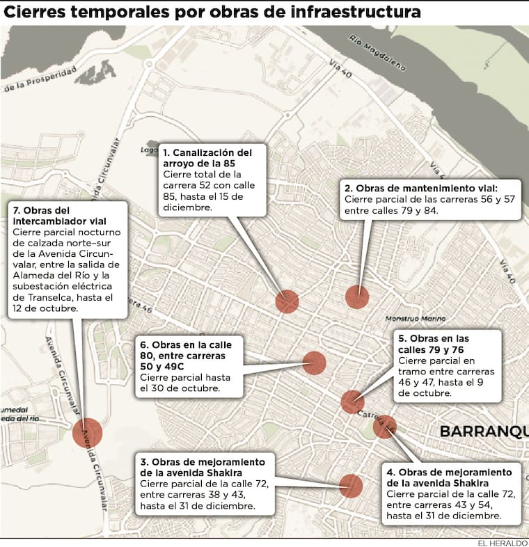 En la avenida Shakira, por su parte, habrá cierres parciales en dos tramos hasta el 31 de diciembre. La medida se viene implementando en la calle 72, entre carreras 38 y 43, así como en el tramo de la calle 72, entre carreras 43 y 54.