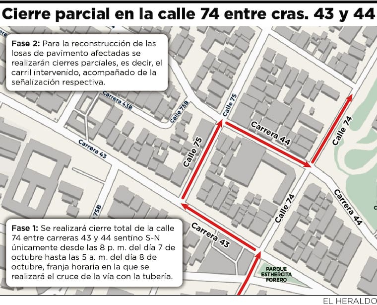 En ese sentido, se habilitaron una serie de desvíos. Por eso, los conductores que transitan por la carrera 43 y se dirigen hacia la calle 74 podrán tomar la calle 75 hasta la carrera 44 y girar a la derecha, para posteriormente desembocar en la calle 74 y tomar ese mismo desvío.