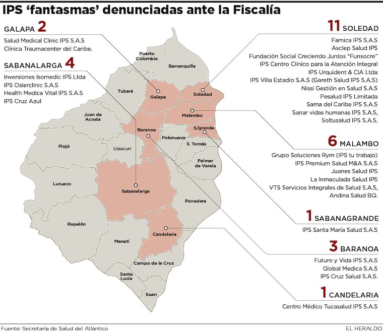 EL HERALDO pudo tener acceso al primer bloque de denuncias que presentó la entidad a la Fiscalía y se pudo constatar que el municipio de Soledad fue reportado con 11 entidades “fantasmas” registradas como Famica IPS S.A.S; Asclep Salud IPS; Fundación Social Creciendo Juntos (Funsocre); IPS Centro Clínico para la Atención Integral; IPS Urquident & CIA Ltda; IPS Villa Estadio S.A.S (Gareth Salud IPS S.A.S); Nissi Gestión en Salud S.A.S; Pesalud IPS Limitada; Sama del Caribe IPS S.A.S; Sanar vidas humanas IPS S.A.S, y Soltusalud IPS S.A.S.
