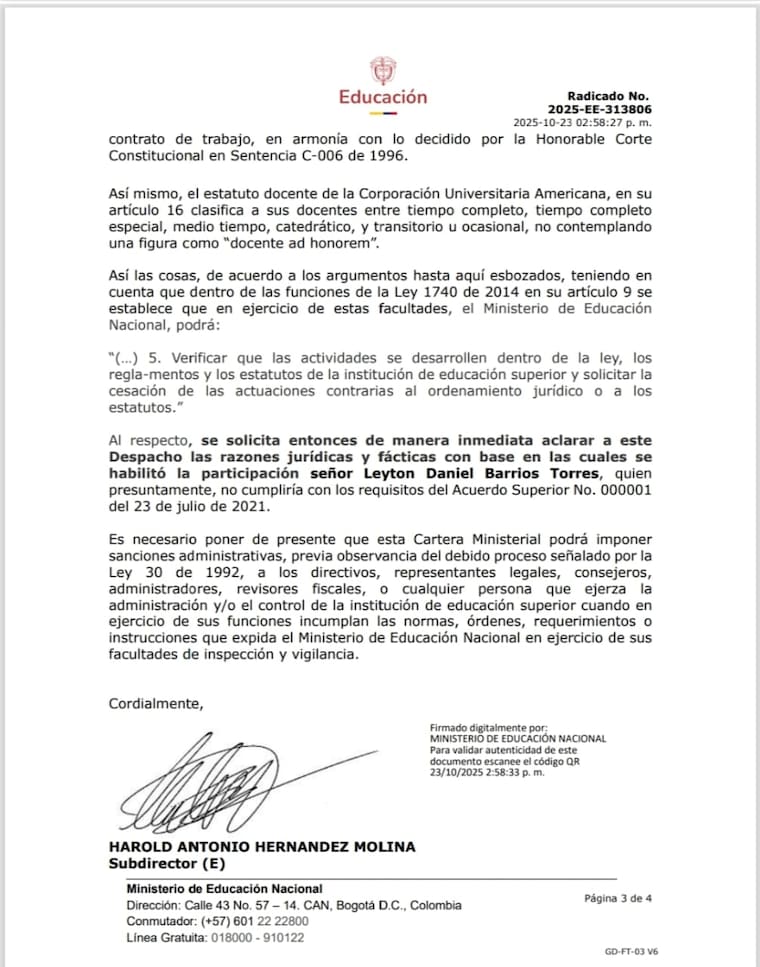 Según el oficio expedido por parte del Ministerio, “este despacho ha tenido conocimiento de las presuntas irregularidades en la acreditación de los requisitos para el proceso de elección y designación del rector de la Universidad del Atlántico 2025 – 2029, por parte de unos de los postulados, el señor Leyton Daniel Barrios Torres”.