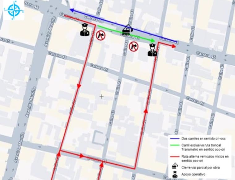 Los conductores que circulan en sentido occidente-oriente serán desviados por la calle 44 hacia el sur, para luego empalmar la carrera 44 en sentido oriente y continuar hasta la calle 42, para luego dirigirse al norte, donde retomarán la carrera 46 hacia el oriente.