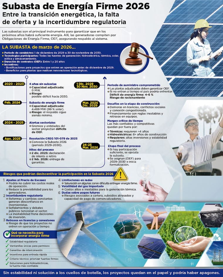 El sector eléctrico sigue en alerta. Mientras la demanda crece, la oferta no despega, las reglas del juego cambian y avanza la presión por la transición energética, la Subasta de Energía Firme que prepara la Creg para 2026 aparece como una luz al final del túnel. Una oportunidad —quizás la más importante en este momento— para asegurar que Colombia sí tendrá la energía que necesitará en 2029 y 2030.