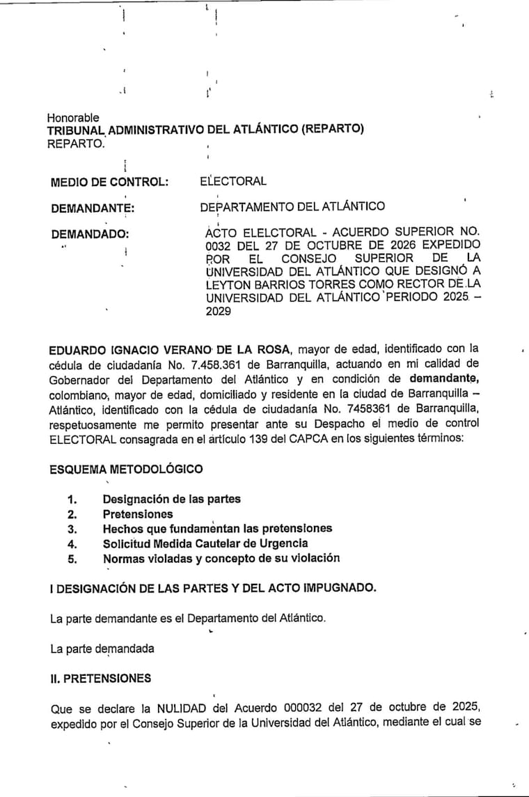 Ante el Tribunal Administrativo del Atlántico, la Gobernación presentó una demanda de control electoral en contra del acuerdo superior expedido para designar a Leyton Barrios Torres como rector de la Universidad del Atlántico para el periodo 2025-2029.