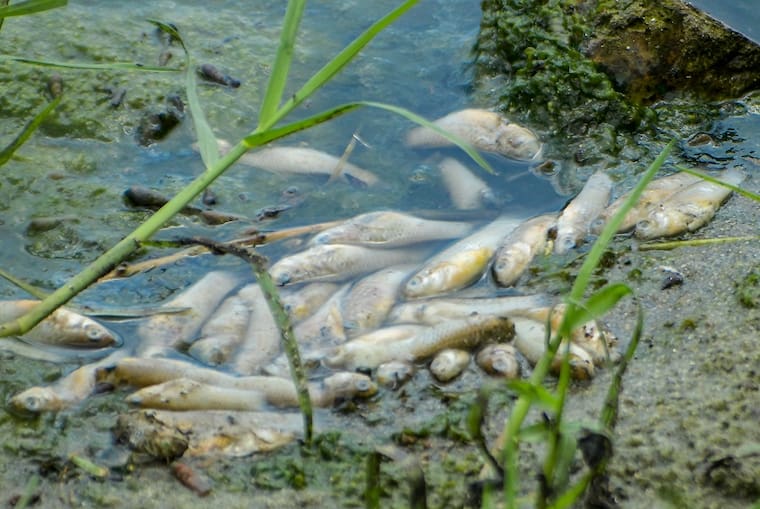 Este fenómeno ocurre con el ingreso de materia orgánica —como nitrógeno, fósforo y otros nutrientes— a un cuerpo de agua, lo que produce un crecimiento desmedido de algas que reducen los niveles de oxígeno en el agua y propicia la mortandad de peces.
