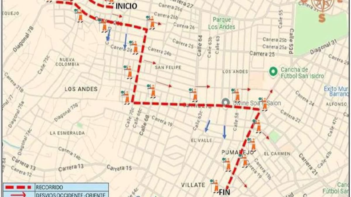 El recorrido del desfile iniciará en la calle 76 con carrera 26A, continuará por la carrera 26 y seguirá por la carrera 25B hasta la calle 70C. Posteriormente, girará a la derecha hasta la carrera 21B, luego a la izquierda hasta la calle 53D, continuará hacia la carrera 16 y finalizará en el parque San Vicente.