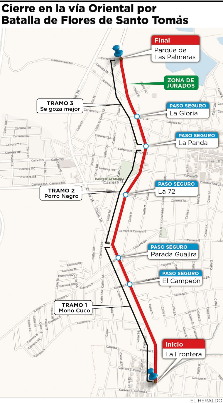 El punto de partida será la carrera 1 con calle Nueva, sobre la vía nacional, en el sector La Frontera, mientras que la finalización se realizará en el parque Las Palmeras, ubicado en la calle 8A con carrera 17, barrio Las Palmeras, municipio de Santo Tomás.