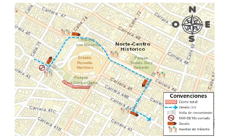 Los conductores que transitan en sentido oeste-este por la carrera 44 deberán girar a la izquierda en la calle 74 y luego a la derecha en la carrera 46, girar a la derecha en la calle 70 hasta retomar en la carrera 44 a la izquierda.