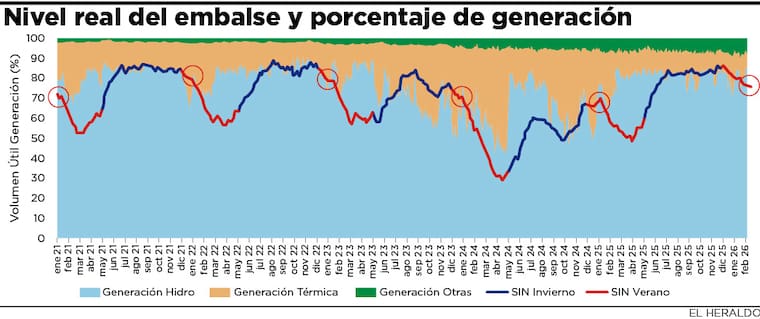 En ese sentido, remarcaron que el alto nivel de los embalses para comienzos de 2026 no corresponde a una estrategia especulativa, sino que obedece a lo que ha sido tradicional en el sistema de generación en Colombia de acuerdo con el comportamiento del clima.