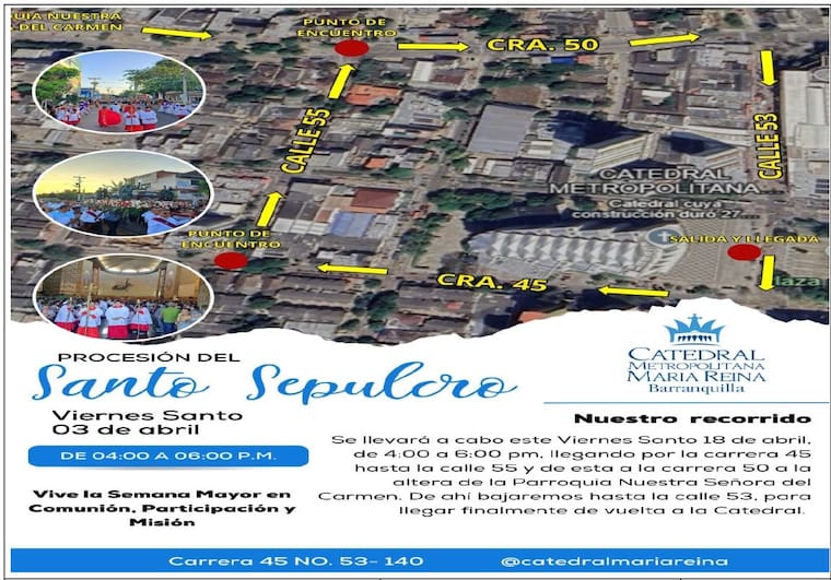 La medida estará vigente entre las 4:00 p.m. y las 6:00 p.m., tiempo durante el cual se desarrollará el recorrido religioso que iniciará en el atrio de la Catedral, frente a la Plaza de la Paz. Desde allí, la procesión avanzará por la calle 53 hacia la carrera 45, continuará hasta la calle 55, girará a la derecha hasta la carrera 50 y luego retomará la calle 53 para regresar al punto de partida.