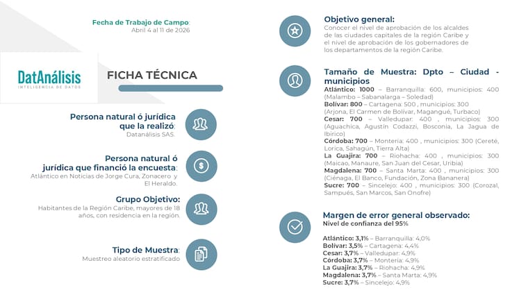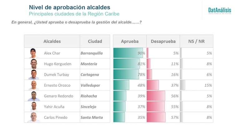 Le siguen: Ernesto Orozco, de Valledupar, con el 48 %; Genaro Redondo, de Riohacha, con el 39 %; Yahir Acuña, de Sincelejo, con el 37 %, y Carlos Pinedo, de Santa Marta, con el 35 %.
