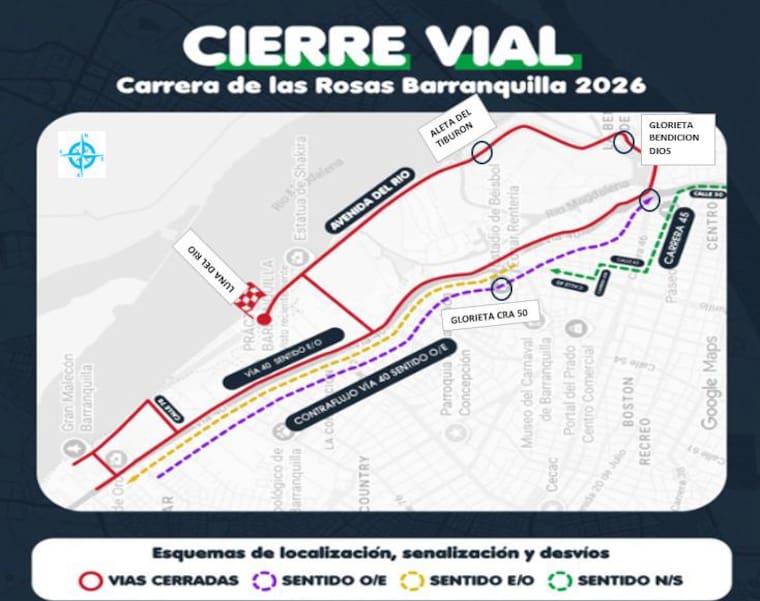 Además, habrá cierre total durante el domingo, de 1:00 a.m. a 10:00 a. m., la avenida del Río, desde la calle 82 pasando por la Aleta del Tiburón hasta llegar a la rotonda de la carrera 46 (sin incluirla); de la calle 69 entre la Vía 40 y la avenida del Río; de la calle 78 entre la Vía 40 y la avenida del Río y de la calle 72 entre la Vía 40 y la avenida del Río.