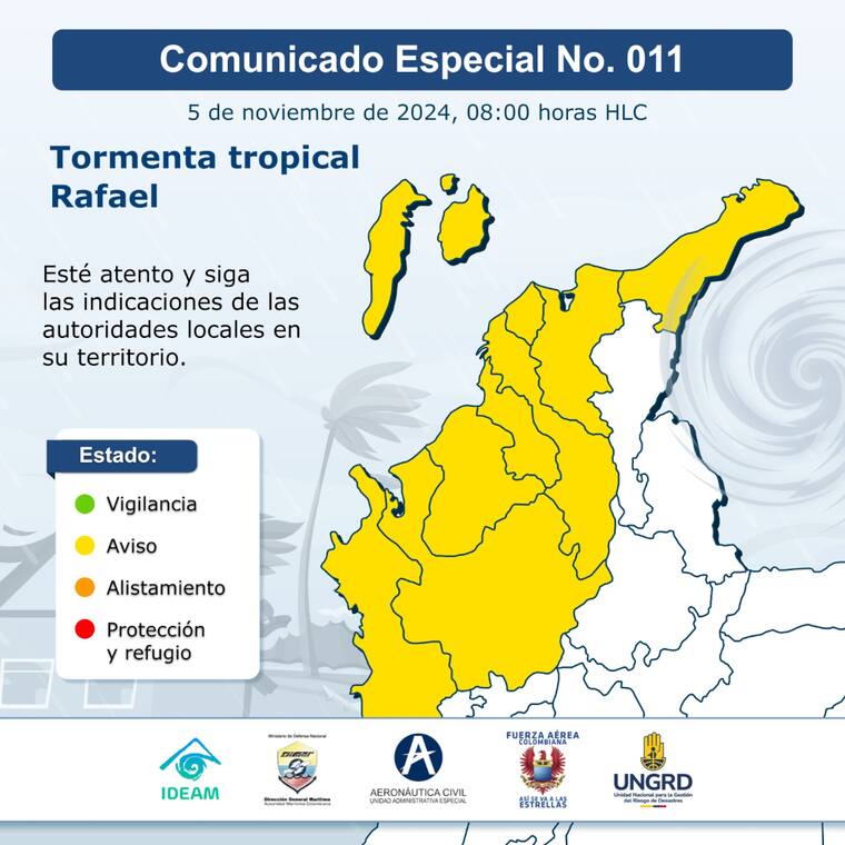De acuerdo con el reporte, la tormenta Rafael se desplaza hacia el noroeste, alejándose del territorio colombiano; sin embargo, este sistema mantiene influencia sobre las condiciones de tiempo y del mar.