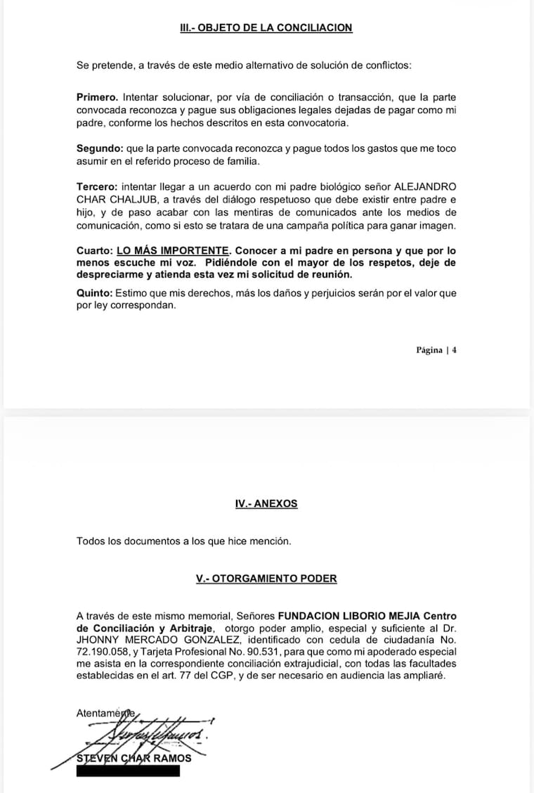 Según se lee en el documento, la solicitud fue realizada por Steven Char, a través de su abogado Johnny Mercado, ante el Centro de Conciliación, Arbitraje y Amigable Composición de la Fundación Liborio Mejía. El joven pidió que la diligencia se pueda llevar a cabo de manera virtual para que Char Chaljub pueda asistir sin inconvenientes.